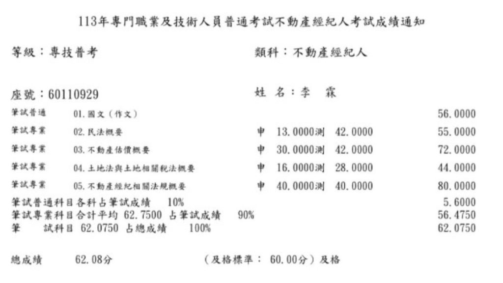 自己是本科系,但繁重的工作、小孩及永遠忙不完的家務,實在有太多藉口逃避,以至於 110 年第 1 次裸考總平均分數 41.4 分,在112年時想趁邁入 39 歲前為自己留下些什麼,也想證明自己,好讓小孩知道爸爸也是有證照的,於是再次著手準備考試。後因為搬家新家裝潢當年度放棄,老天保佑讓我沒參加錄取率僅 5.79% 的112年考試,用舊生姿態續報名 113年考試,最終以 62.08 分低空飛過錄取率 18.1% 的考試。